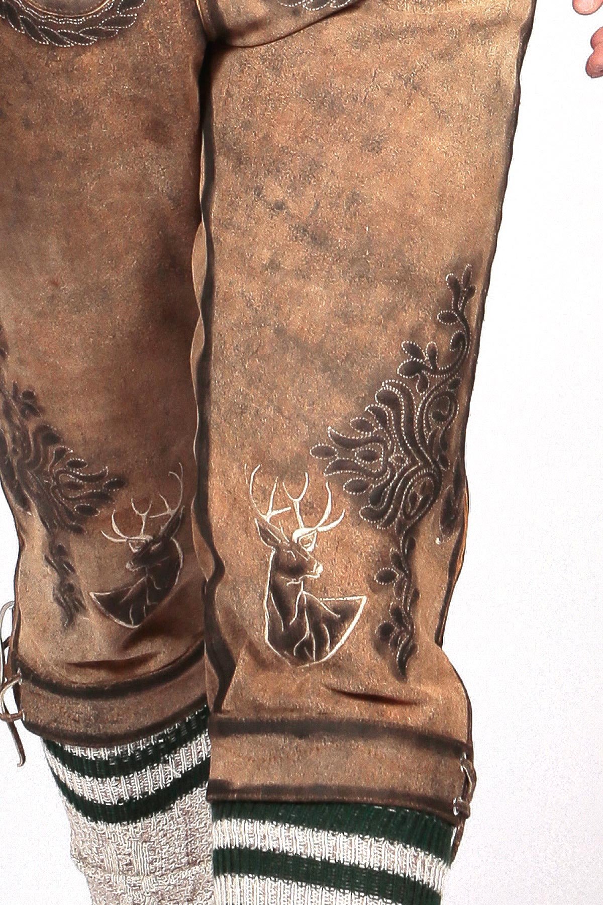 Manufactured from the best quality leather including traditional detailed motifs, this traditionally designed mens lederhosen is the ideal companion for folk festivals, Oktoberfest or Halloween as well. The classic embroidery on the Bavarian mens leather knee long trousers has a display of the Oktoberfest emblem featuring beige colored deer and leaf motif embroidery with Bavarian floral details.