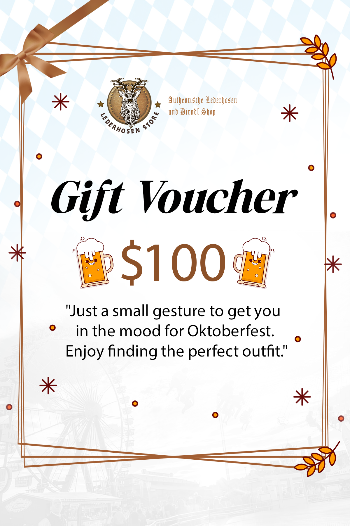 Gift an Oktoberfest surprise voucher to your loved ones miles apart! Suitable for Birthdays, Oktoberfest, Valentine’s, or any special occasion, our digital gift cards are the perfect present for anyone who adores Bavarian tradition and festive fashion. Once you select a beautifully themed gift card and add a personal touch to your message, it’s ready to be sent instantly or scheduled for your special moments. The recipient can effortlessly redeem it at our online store using the coupon and checkout to embrace the spirit of Oktoberfest with our exclusive collection of dirndls and lederhosen. Perfect for gifting, even better for receiving—Prost to sharing Oktoberfest fun!