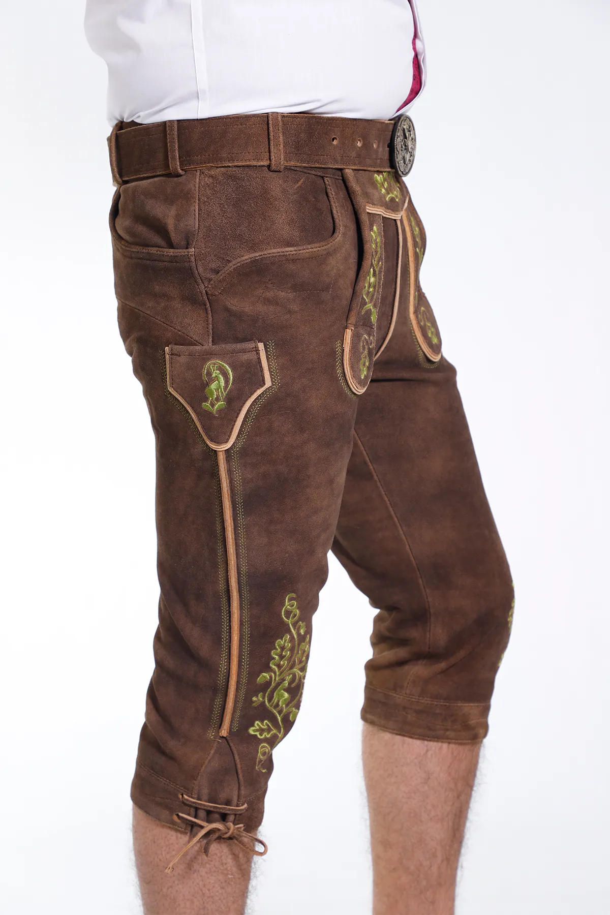 Our classic German Bundhosen features an advanced button closure system with a front flap, adjustable back waistband, and matching belt. The system ensures a perfect fit that can be adjusted to suit your comfort. The matching belt and Traditional Bavarian Metal Buckle add a touch of elegance with smart fitting, completing the traditional Bavarian look.