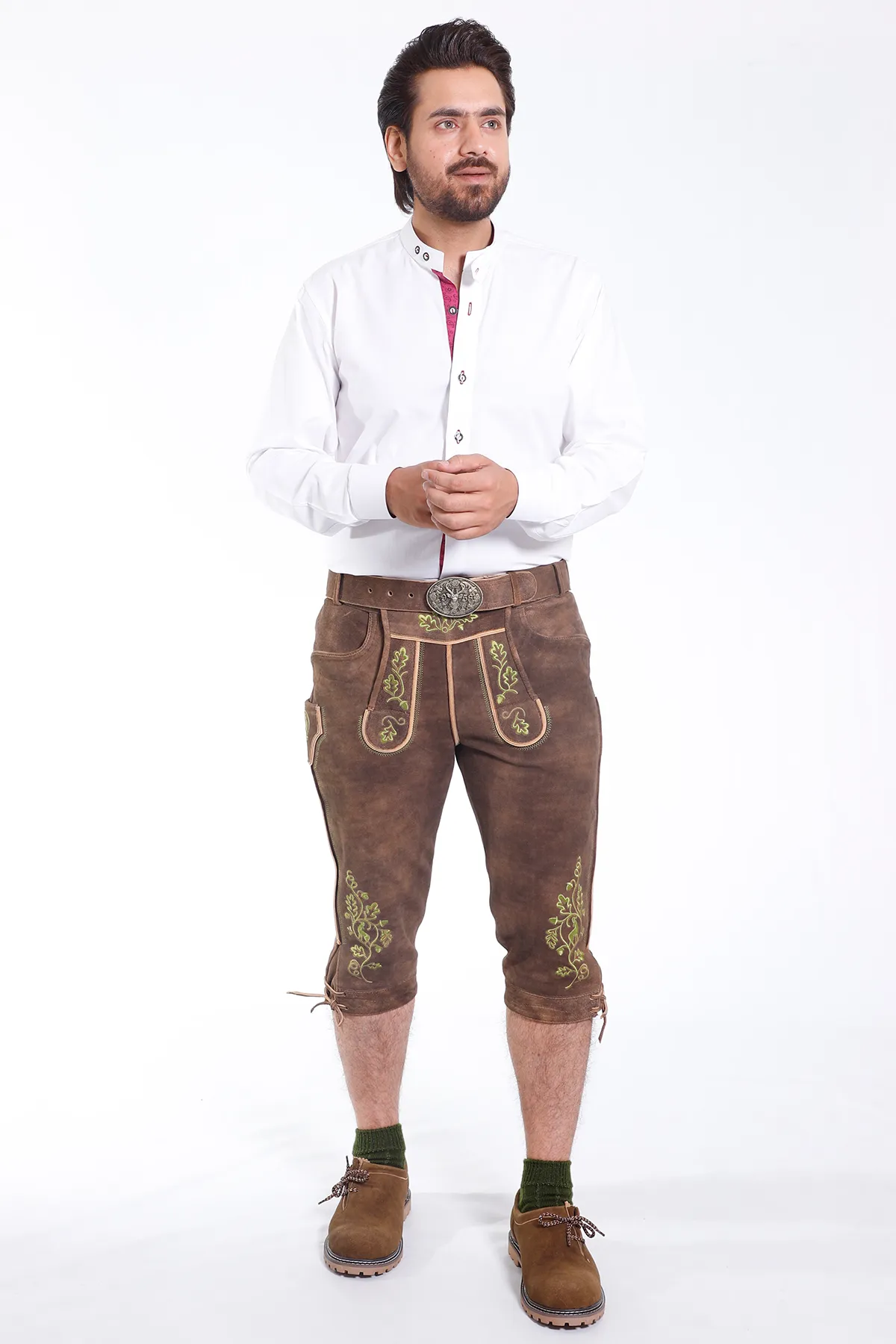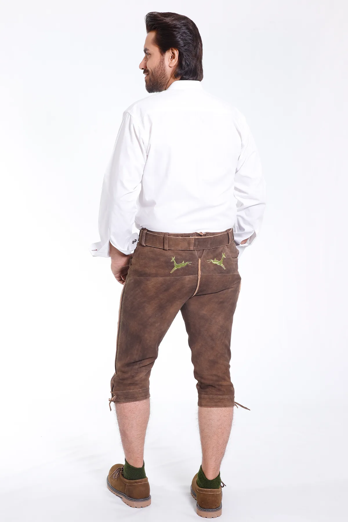 Experience timeless style and comfort in our traditional Knee Length Lederhosen Shorts made of authentic goat leather. These knee-length leather trousers have a robust look and are noticeably supple. This Bundhosen attire is suitable for Oktoberfest, wedding celebrations, and other casual to formal gatherings.