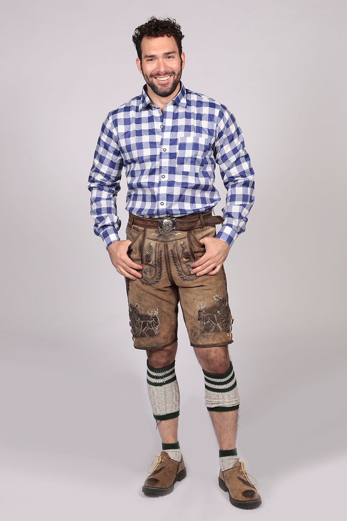 This blue checkered shirt has a prominent diamond check with a neat line of buckhorn style buttons. This Bavarian shirt is made of mix cotton and polyester that gives it a fresh nature touch. Add it with a pair of light tobacco or camel color lederhosen pants. Perfect for every fun occasion including Oktoberfest this year.