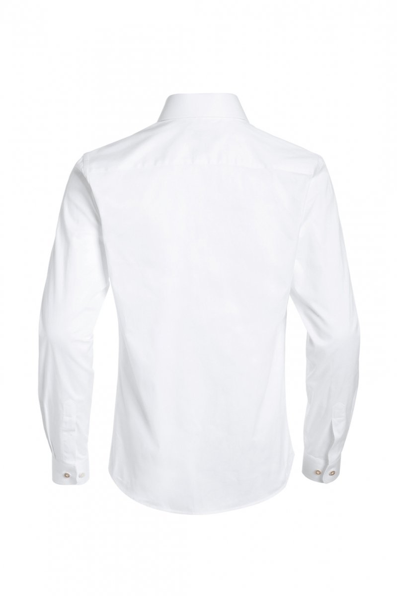 This white dress shirt has a slim fitting for a tight waist with compressed arms tucked in neat cuffs. This Bavarian shirt is made of mix cotton and polyester that gives it a gleaming look. A complete royal look with a pair of rusty or black leather trousers, lederhosen or even Bundhosen. Perfect for every occasion including Oktoberfest.
