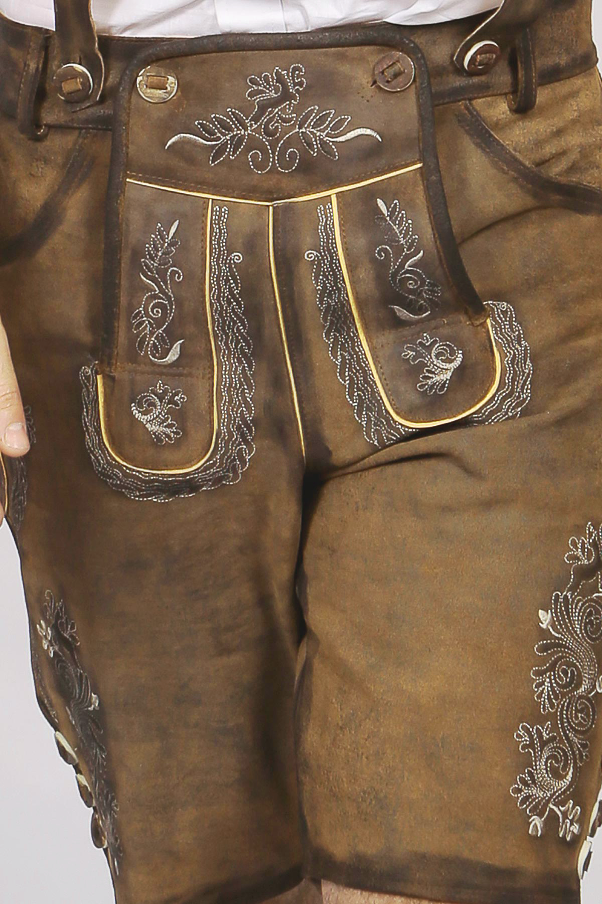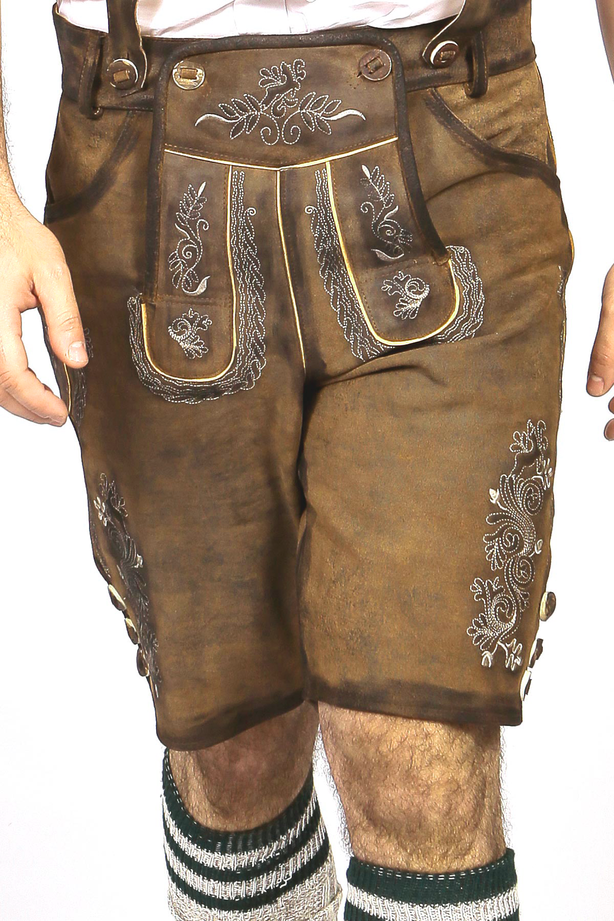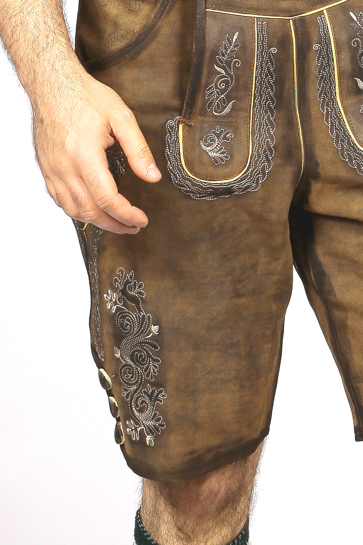 Manufactured from the best quality leather including traditional detailed motifs, these traditionally designed mens Lederhosen are the ideal companion for folk festivals, Oktoberfest or Halloween as well. The classic embroidery on the Bavarian mens leather shorts has a display of the Oktoberfest emblem featuring beige colored deer and leaf motif embroidery with Bavarian floral details.
