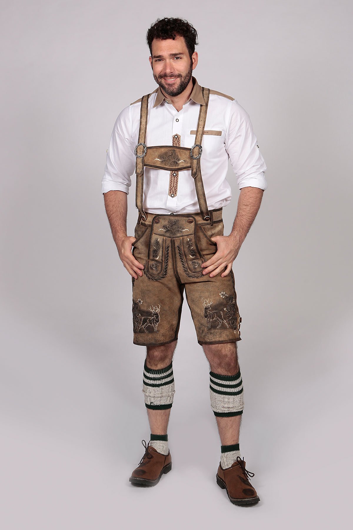 This lederhosen outfit can be completed with a checkered or embroidered shirt. Checkered Bavarian shirts add to the overall look of authentic Lederhosen outfits and are an essential part of the Oktoberfest celebrations.You can also add a pair of Haferlschuhe Lederhosen shoes from our unlimited assortment featuring delicate embroidery, and side laces. DonÂ’t forget our classic Oktoberfest vests and lederhosen waistcoats to complete your perfect outfits!