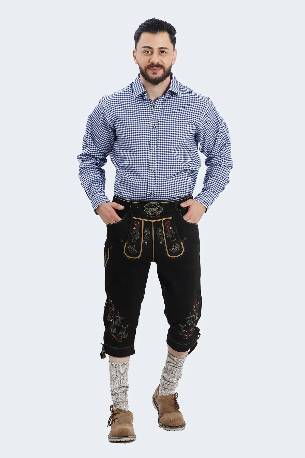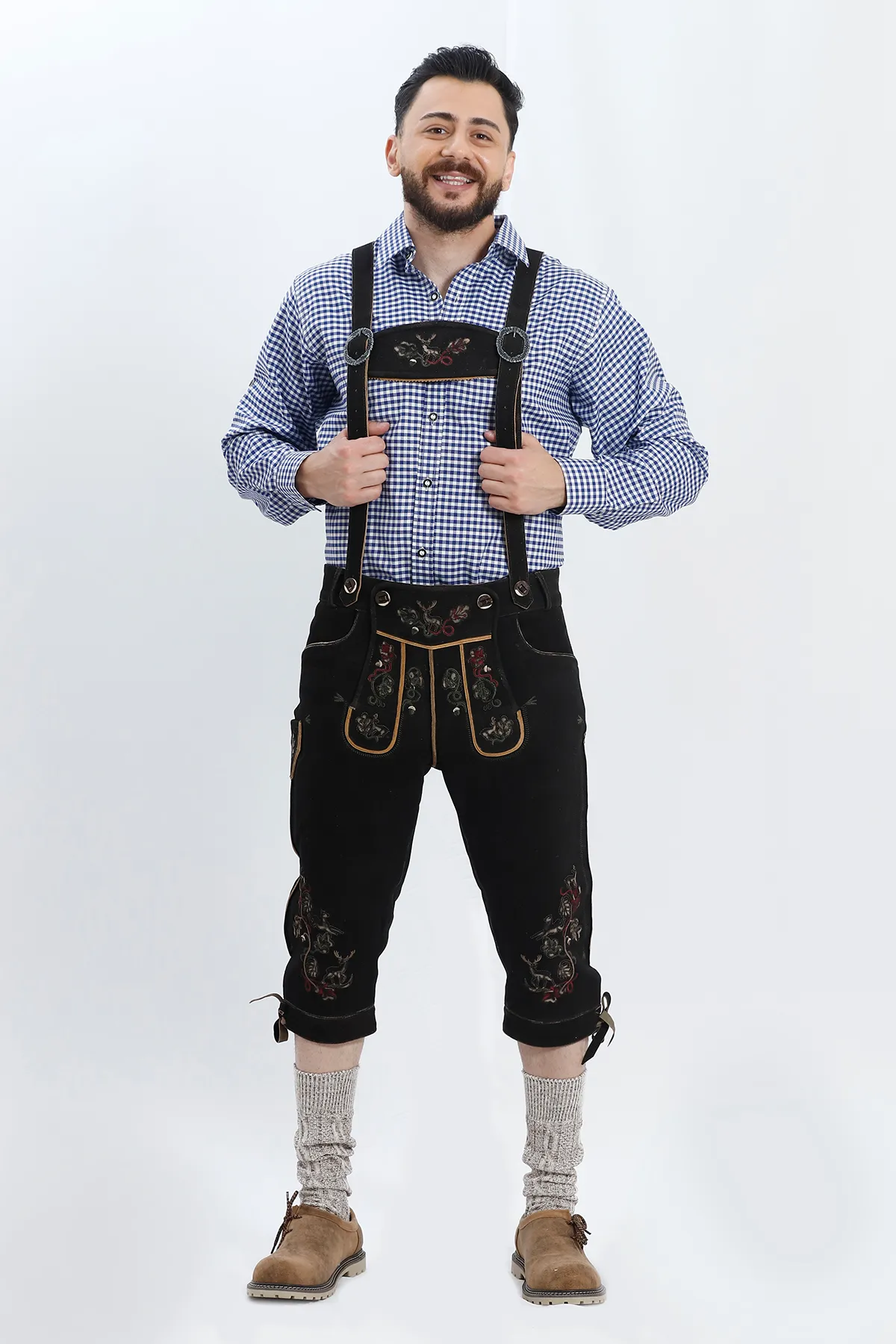Experience timeless style and comfort in our traditional Knee Length Lederhosen Shorts made of authentic goat leather. These knee-length leather trousers have a robust look and are noticeably supple. This Bundhosen attire is suitable for Oktoberfest, wedding celebrations, and other casual to formal gatherings.